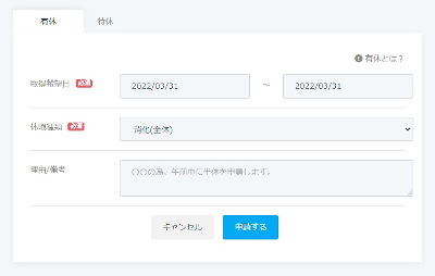 有休ノートではシンプルなフォーム画面で簡単に有休の申請がおこなえます。