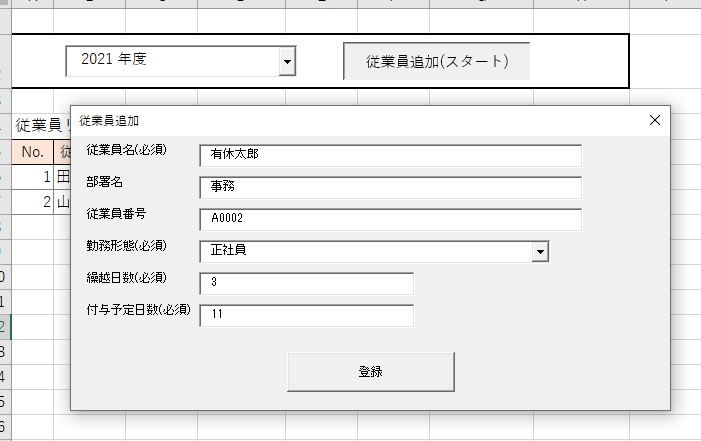 従業員の登録が完了すると自動的に有休管理のシートが作成されます。